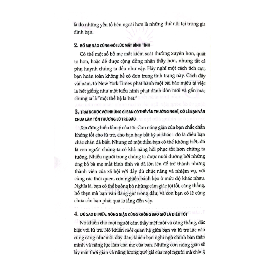 Cuốn sách chỉ ra những điểm kích hoạt phản ứng thiếu kiểm soát của cha mẹ đồng thời chỉ ra các phương pháp để cha mẹ bình tĩnh hơn, thư giãn hơn và cân bằng hơn trong khi giao tiếp và nuôi dạy con. Những lời khuyên không phải là mảnh ghép hoàn hảo cho bạn và cho gia đình. Nhưng những lời khuyên trong cuốn sách này có thể áp dụng cho nhiều đối tượng và dễ dàng điều chỉnh cho phù hợp với hoàn cảnh và lối sống của bạn.