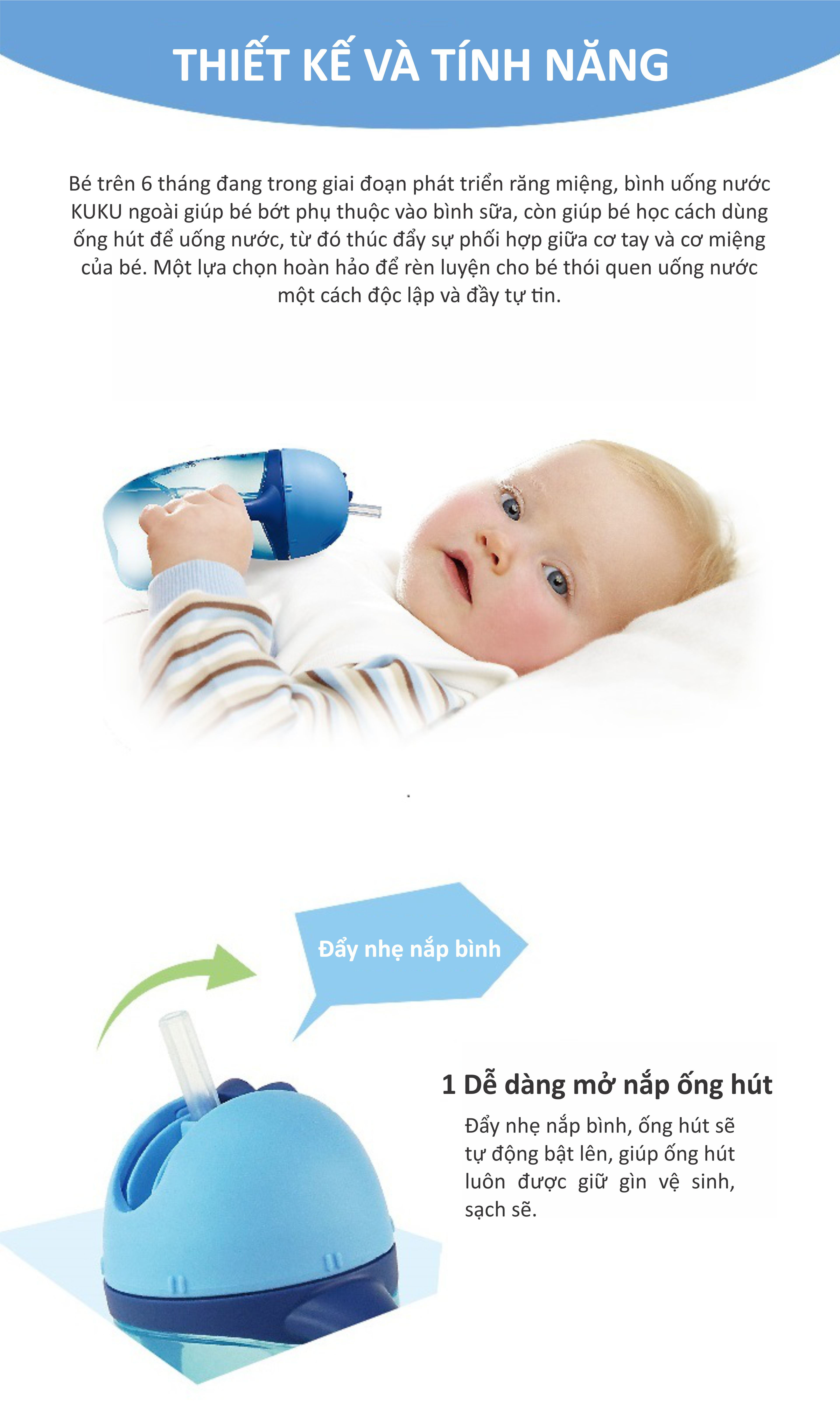 - Dung tích 260ml; - Sự lựa chọn hoàn hảo cho bước chuyển từ bình sữa sang bình nước Bé trên 6 tháng đang trong giai đoạn phát triển răng miệng, bình nước Kuku ngoài