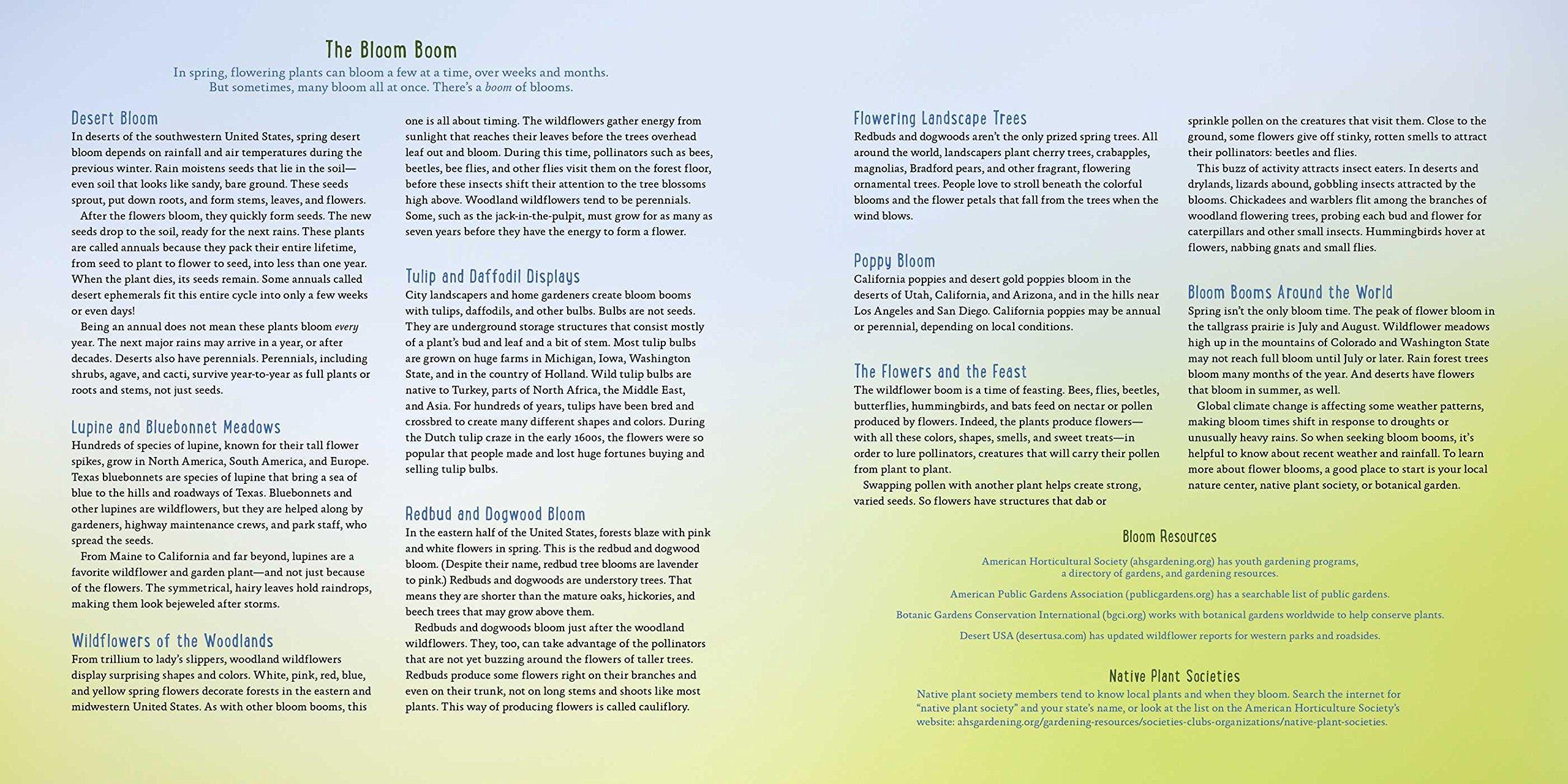 When spring arrives, flowers of all kinds sprout and grow buds and bloom. Sometimes, they bloom a few at a time. But other times, many will bloom at once in a colorful flower boom! This photographic exploration of flowers goes from the desert to the woodlands and beyond, celebrating their beautiful variety and the science behind these colorful displays.