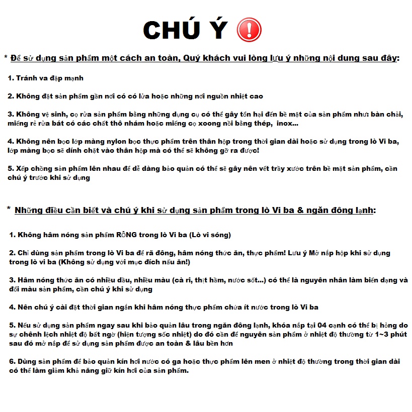 === ƯU ĐIỂM CỦA SẢN PHẨM === + Nguyên liệu nhựa nguyên sinh cao cấp, đã thông qua kiểm định theo tiêu chuẩn về an toàn vệ sinh thực phẩm. + Đạt tiêu chuẩn khắt