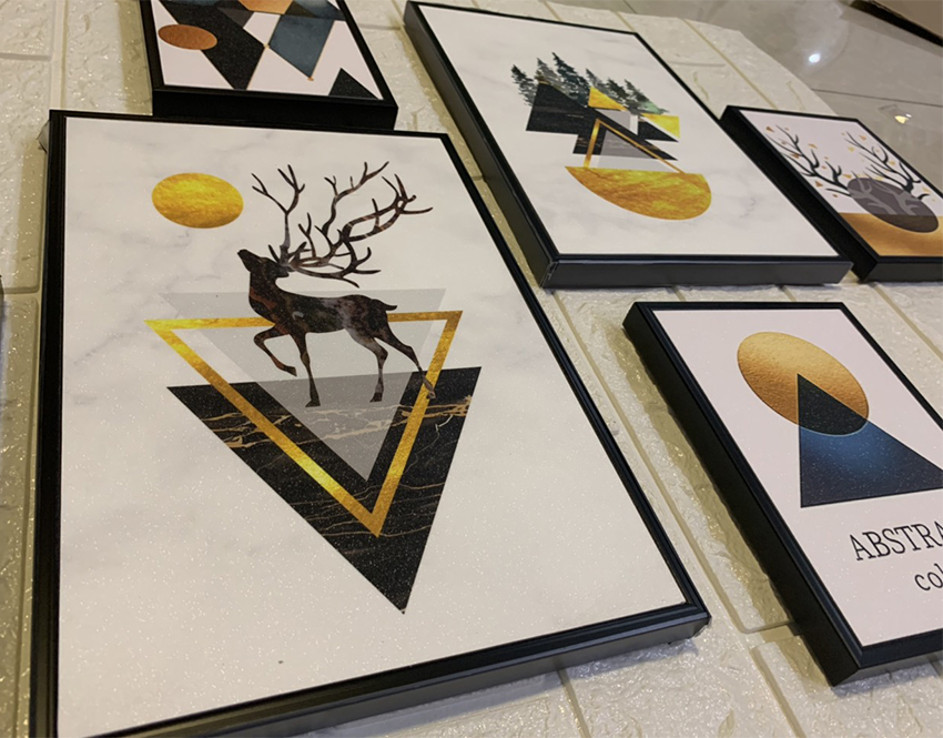 Kích thước : 1 tranh 30x40cm, 3 tranh 20x30cm, 2 tranh 15x20cm Công nghệ in phủ bóng tráng gương trên fomex, khung tranh composite siêu nhẹ Độ bền sản phẩm trên 10 năm Chống nước