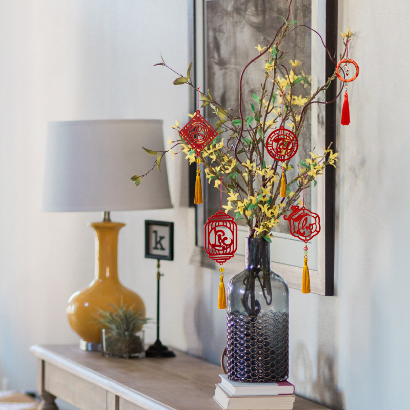 Bộ 11 phụ kiện trang trí Tết thư pháp và hoa văn trong Khai Lộc Hoàng Kim với thiết kế mới lạ và đẹp mắt.