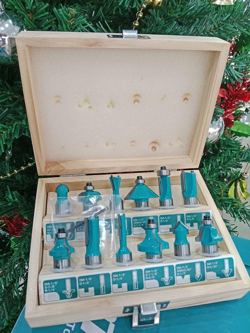 -Gồm 3 mũi thẳng :6mm,12mm,16mm 1pcs 1/2" 90°V-groove bit, 1pcs 1/2" Dovetail bit 1pcs 32mm 45°Chamfer bit , 1pcs 1/2" flush trim bits