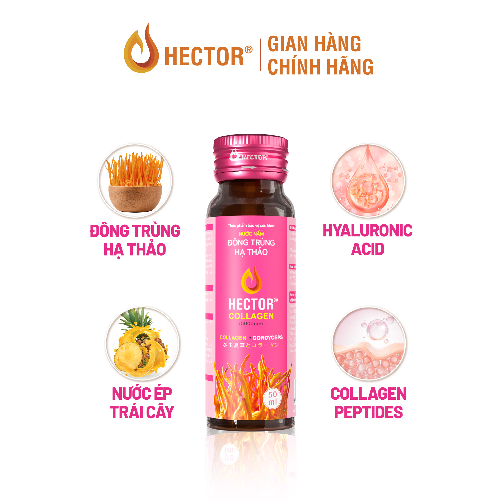 Nước nấm Đông trùng hạ thảo Hector Collagen là sự kết hợp độc đáo giữa chiết xuất nấm Đông trùng hạ thảo và Collagen peptides từ cá lên đến 5000 mg. Trong Nước nấm Đông trùng hạ thảo Hector Collagen còn có thành phần dưỡng chất HA cùng nhiều loại nước ép trái cây tươi hỗ trợ dưỡng