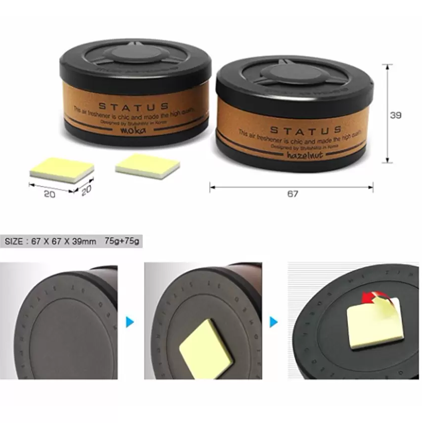 THÔNG TIN SẢN PHẨM Tên sản phâm : Sáp thơm khử mùi cho ô tô Status Korea CÔng dụng : Giúp khử mùi hôi ,thư thái tinh thần, chống say xe Thành phần : Cafe nguyên chất , chất tạo dẻo Hướng dẫn sử dụng : Tháo nắp bỏ lớp giấy bạc bảo quản , Để nơi mình muốn Hướng dẫn bảo quản : Bảo quản nơi khô ráo, thoáng mát Bộ sản phẩm : Gồm 2 hộp gel 60g hương cafe nguyên chất Hazelnut & Moka Quy cách đóng gói : Hộp x 2 Kích thước vỉ : D7,5 x R7 x C6,5 Cm Mùi hương : Moka và Hazelnut đặc biệt Màu sắc : Nâu Xuất xứ : Made In Korea Trọng lượng : 200 (g)