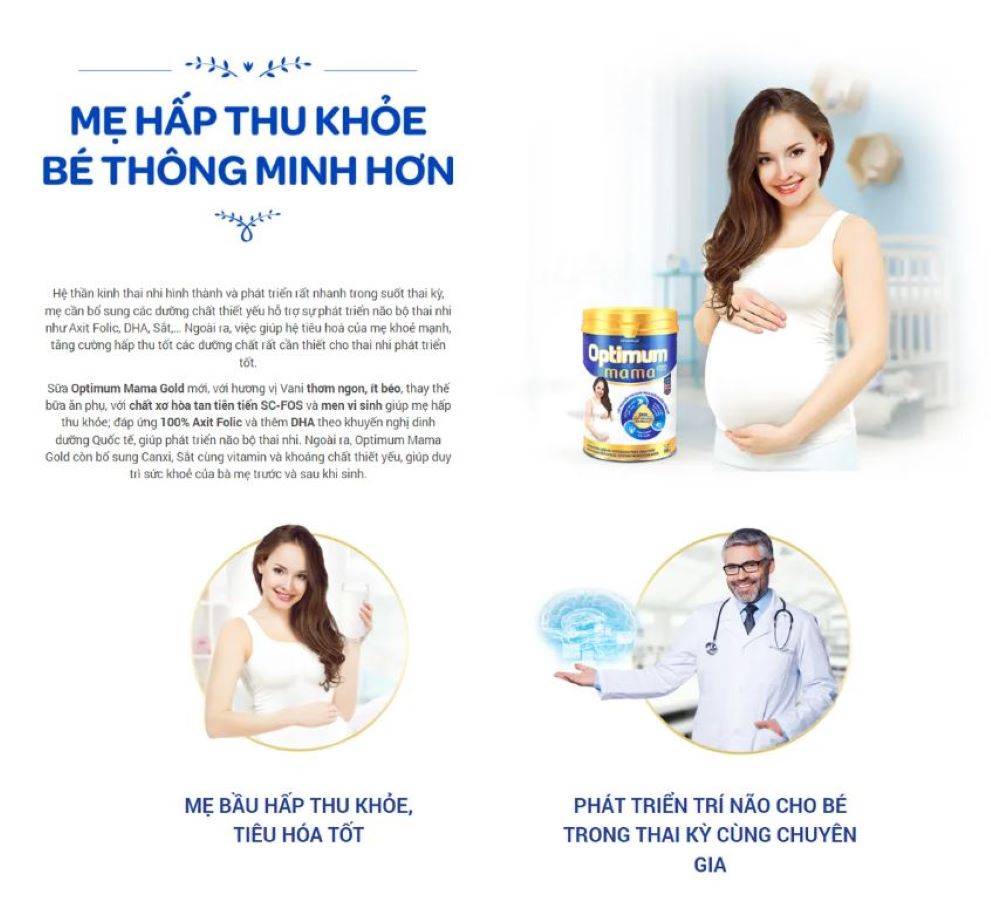 - Dưỡng chất phát triển não bộ + Cung cấp lượng DHA theo khuyến nghị của chuyên gia y tế Thế Giới FAO/WHO* cho bà mẹ mang thai, kết hợp với Cholin, Iốt giúp phát triển não bộ của thai nhi. + Axít Folic: uống 2 ly mỗi ngày đáp ứng 100% nhu cầu Axít Folic* giúp giảm nguy cơ khuyết tật ống thần kinh ở thai nhi. () Cùng với bữa ăn, 2 ly Optimum Mama Gold giúp đáp ứng lượng DHA theo nhu cầu khuyến nghị hàng ngày của FAO/WHO (2010) (**) Theo nhu cầu dinh dưỡng khuyến nghị của Viện Dinh Dưỡng Quốc Gia
