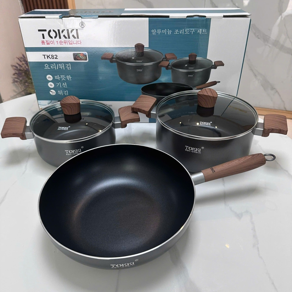 Bộ 2 nồi 1 chảo nhôm chống dính 5 lớp Tokki Hàn Quốc TK82 đáy từ Mã sản phẩm: TK82 Kích thước: