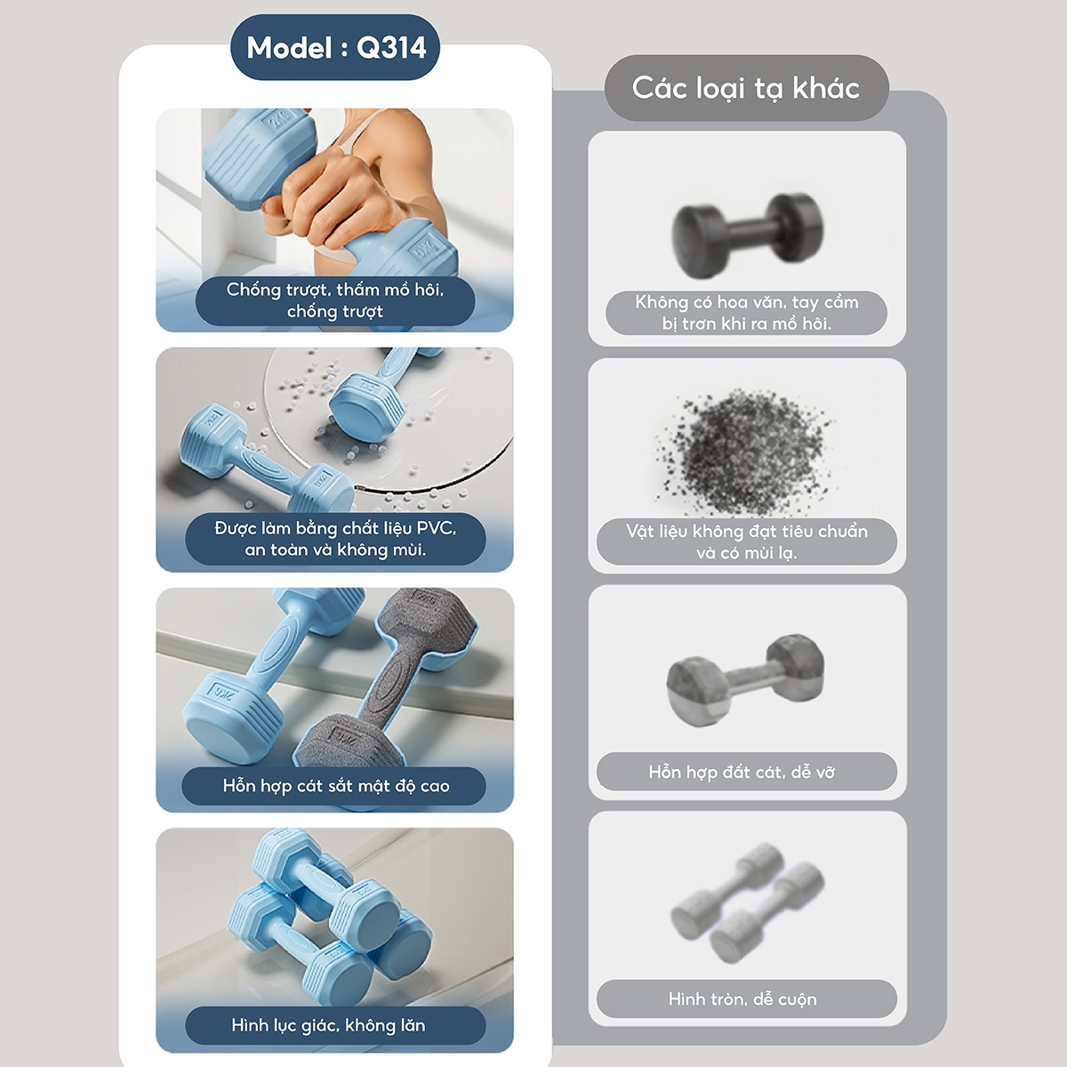 * Thông tin cơ bản : Tạ tay nữ nhỏ gọn lõi sắt bọc nhựa cao cấp JH-0618 - Chất liệu: Sắt nguyên khối phủ cao su - Lớp cao su êm ái, vận động lâu