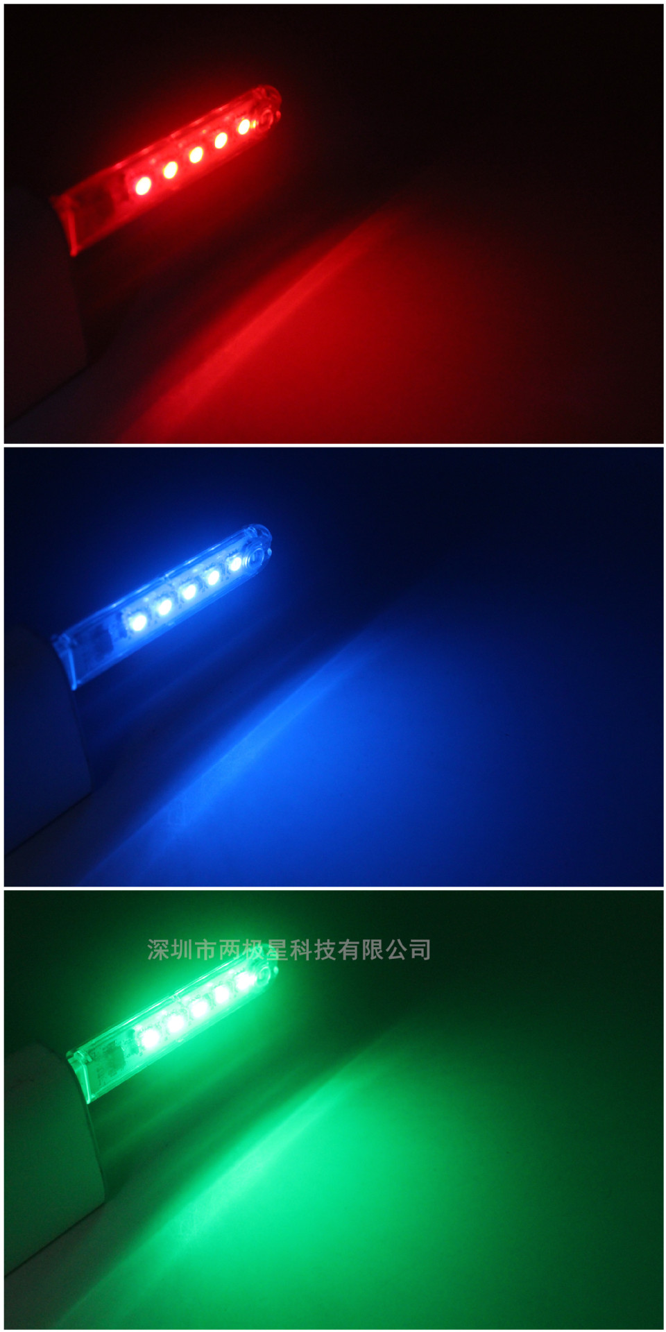 Thanh đèn LED RGB với 5 bóng LED 5050 hiển thị được 7 màu, có nút để thay đổi nhiều chế độ chớp: - Sáng một màu - Chớp liên tục - Đổi màu êm
