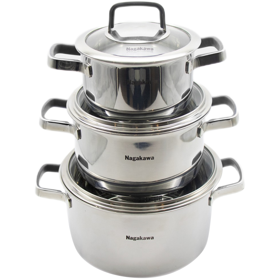 ✨Bộ 3 Nồi Đáy Từ Đa Lớp Nguyên Khối Inox 304 Cao Cấp Nagakawa NAG1353 (16cm, 20cm, 24cm) - Dùng Trên Mọi Loại Bếp - Hàng Chính Hãng