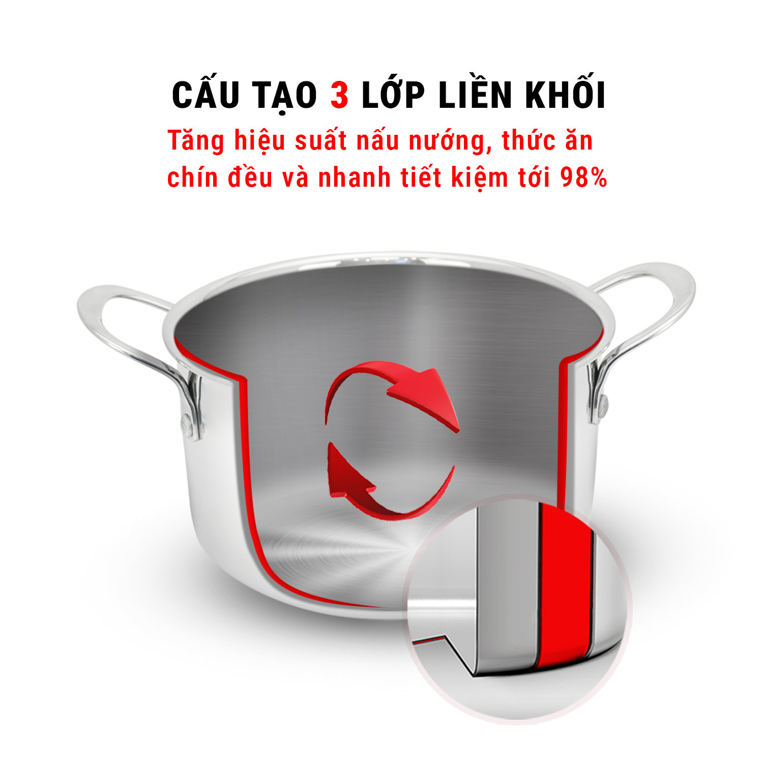 - Chất liệu: Inox cao cấp 18/10 - Đáy: Làm bằng thép sắt từ gồm 5 lớp cho phép dẫn nhiệt nhanh, phân phối nhiệt tối ưu - Thiết kế kết cấu chống trơn trượt: