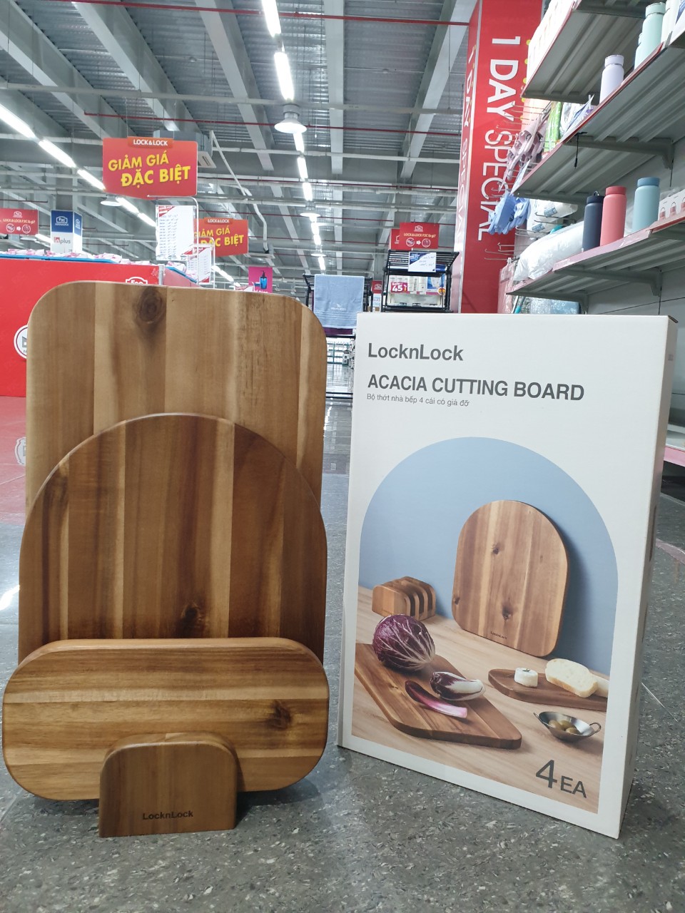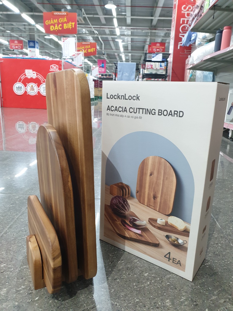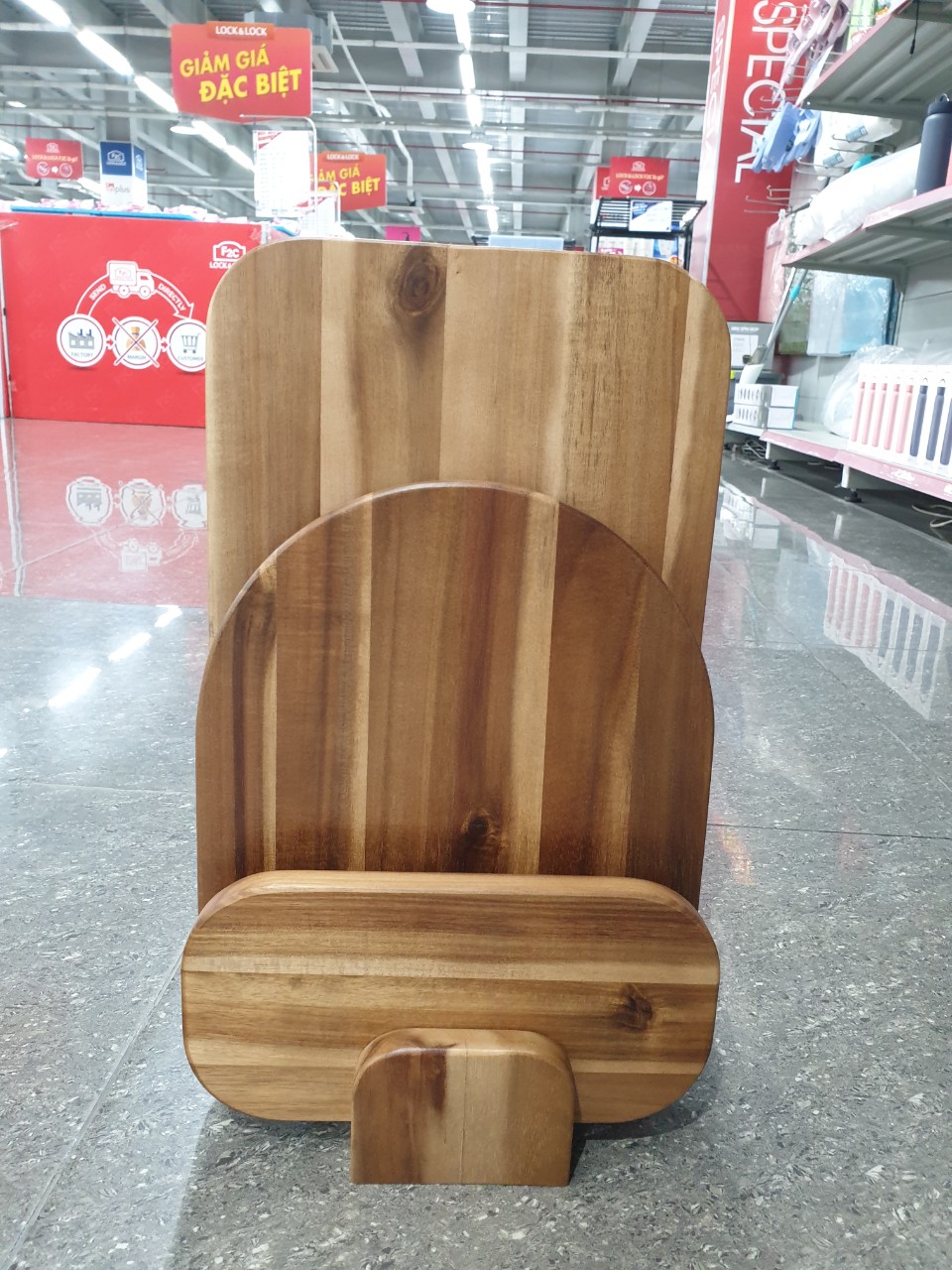 Bộ 3 thớt gỗ keo Lock&Lock Acacia wood cutting board set màu nâu sẫm kèm giá đỡ CKD075S4