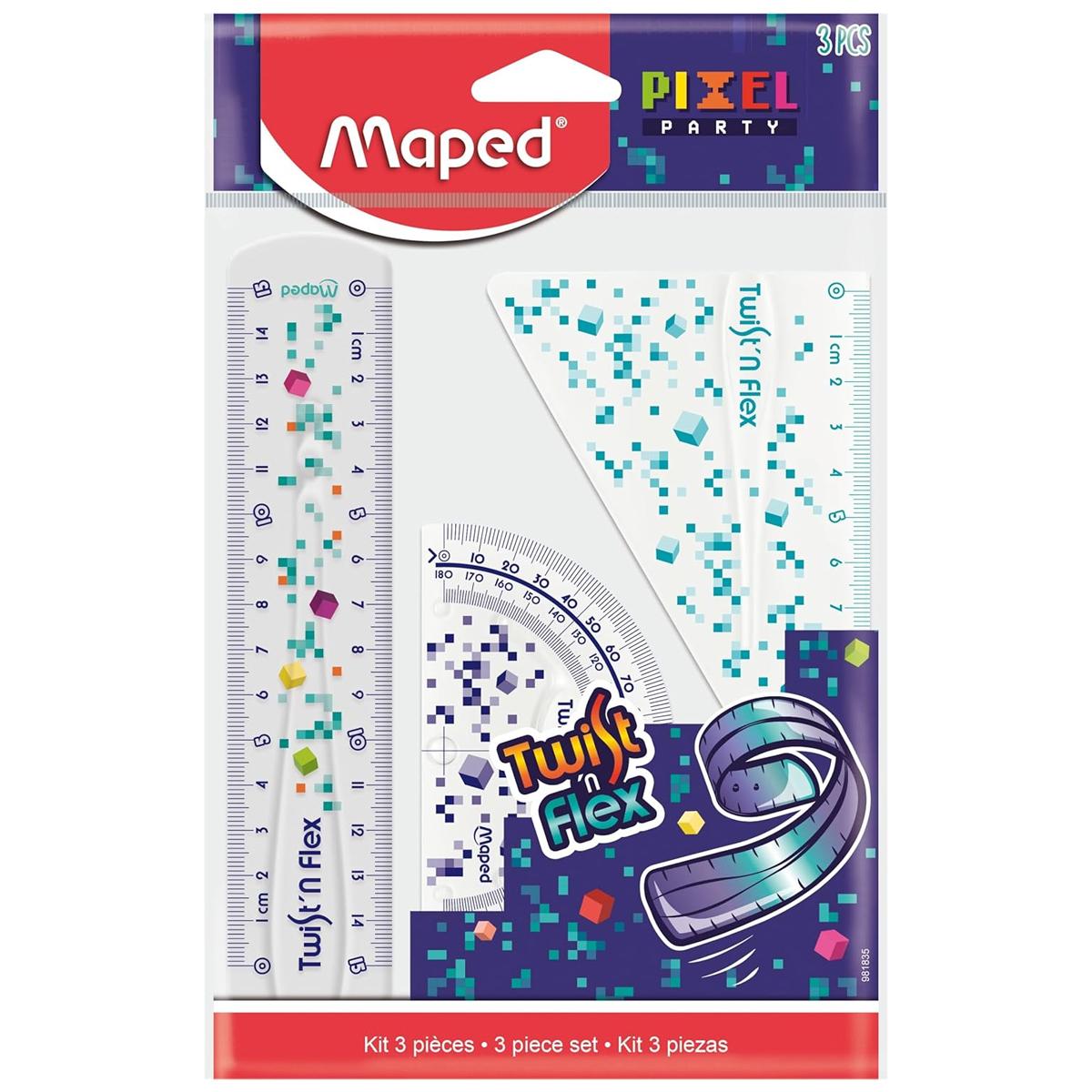 Bộ 3 Thước Học Sinh Cuộn Mềm Pixel Party - Maped 981835 được làm từ chất liệu nhựa cao cấp, bền và có độ dẻo nhất định nên khó gãy. Sản phẩm gồm 3 loại thước thường dùng trong học tập hoặc vẽ kiến trúc: thước thẳng, thước tam giác, thước đo độ. Thước được in ấn rõ nét từng chữ số, không phai mờ khi sử dụng lâu dài. Thước có màu sắc đẹp mắt, tạo sự tươi mới cho không gian bàn học, bàn làm việc.
