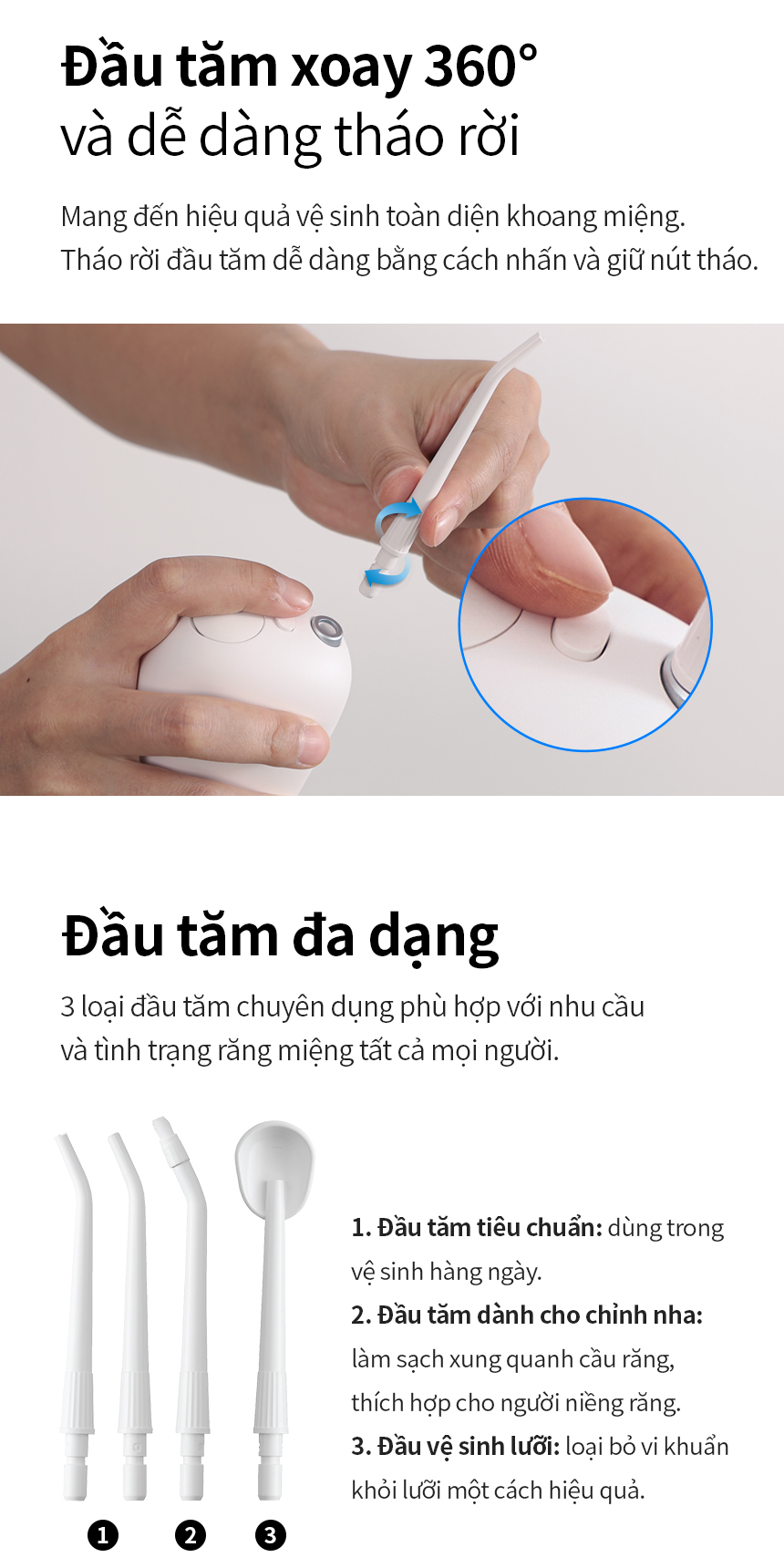 - Đa dạng đầu tăm đi kèm: Phù hợp với nhu cầu và tình trạng răng miệng của tất cả mọi người Đầu tăm tiêu chuẩn x 2 cái: dùng trong vệ sinh hàng ngày. Đầu tăm dành cho chỉnh nha x 1 cái: làm sạch xung quanh cầu răng, thích hợp cho người niềng răng. Đầu vệ sinh lưỡi x 1 cái: loại bỏ vi khuẩn khỏi lưỡi một cách hiệu quả.