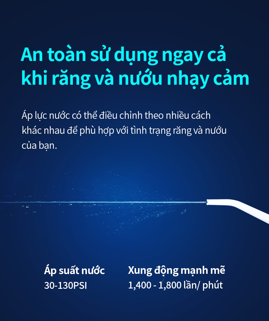 Máy tăm nước MAXVI chăm sóc răng miệng tuyệt vời nhất Máy tăm nước Maxvi xịt tia nước có áp suất đến 100 PSI, tần số xung nước đến 1.800 lần/phút. Tùy theo từng vị trí và thời điểm, có