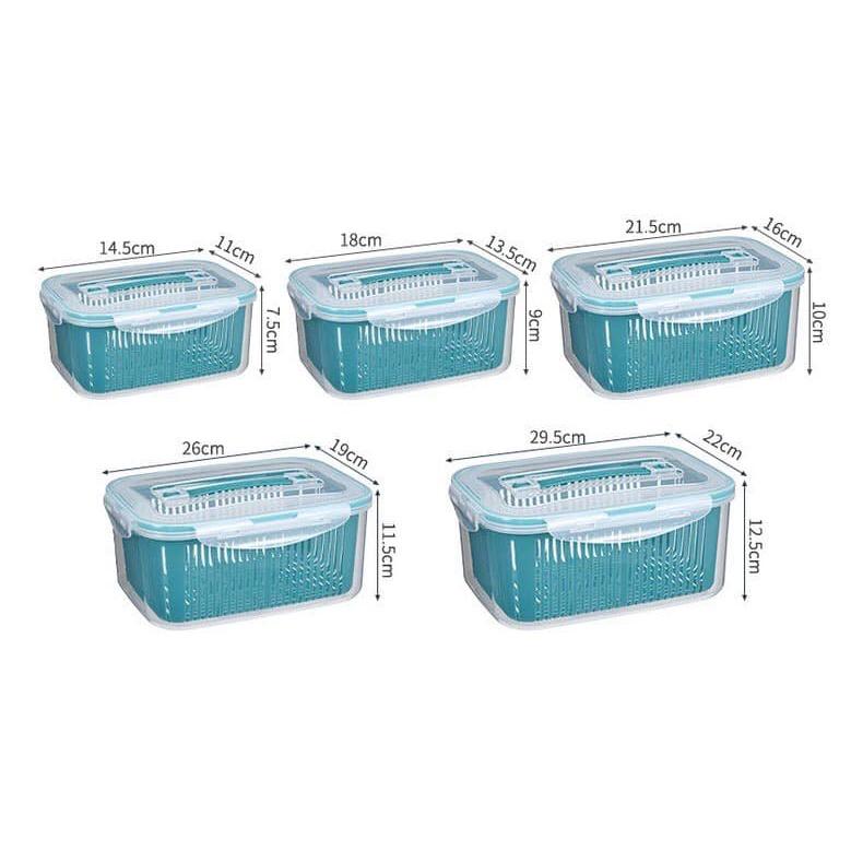 Bộ 5 Hộp Đựng Thực Phẩm Giỏ Có Nắp Đậy Khay Nhựa Kèm Rổ Ráo Nước Để Tủ Lạnh Bảo  Quản Thức Ăn Tiện Dụng Bộ gồm 5 hộp, mỗi hộp có 2 lớp cao cấp có nắp đậy đựng thực phẩm đồ ăn tiện lợi - Bộ rổ nhựa 2 lớp , 1 lớp rổ nhựa PP , 1 lớp nhựa PS cứng trong suốt - Chất liệu cứng cáp , tiện lợi , dùng đựng rau củ quả , thức ăn, thực phẩm trong tủ lạnh, vừa  bảo quản được thực phẩm luôn tươi mới, không lo tủ lạnh bị ám mùi vì có nắp đậy kín hút chân không , vừa tiết kiệm diện tích nên tủ lạnh trông rất gọn gàng và đẹp mắt - Kích thước: • 14.5 * 11.7 * 5 cm • 18 * 13.5 * 9 cm • 21.5 * 16 * 10 cm • 26 * 18 * 11.5 cm • 29.5 * 22 * 12.5 cm - Hộp Bảo Quản Sản Phẩm Tươi - thùng chứa được thiết kế với lỗ thông hơi điều chỉnh có thể  điều chỉnh luồng không khí vào và ra, kiểm soát độ ẩm bên trong, giúp ngăn ngừa hư hỏng, giữ trái cây và rau quả tươi đến hai tuần để giữ được độ tươi tối đa. - Thiết kế lỗ thông hơi giữ cho rau củ tươi ngon / thực phẩm  Chất liệu - Được làm bằng vật liệu PET an toàn thực phẩm chất lượng cao có khả năng chống bám bẩn và mùi hôi hiệu quả, 100% không chứa BPA. Vừa để bảo quản trong tủ lạnh, vừa cho bữa tiệc dã ngoại lành mạnh. - Thiết kế có vách ngăn - Tất cả các thùng chứa sản phẩm này đều có các vách ngăn có thể gập lại có thể điều chỉnh để lưu trữ được phân loại; Có thể đựng hầu hết các loại rau củ quả như xà lách, bắp cải, dâu tây, việt quất , tiết kiệm diện tích, sạch sẽ và không có mùi hôi. Trân trọng cảm ơn Quý khách hàng!