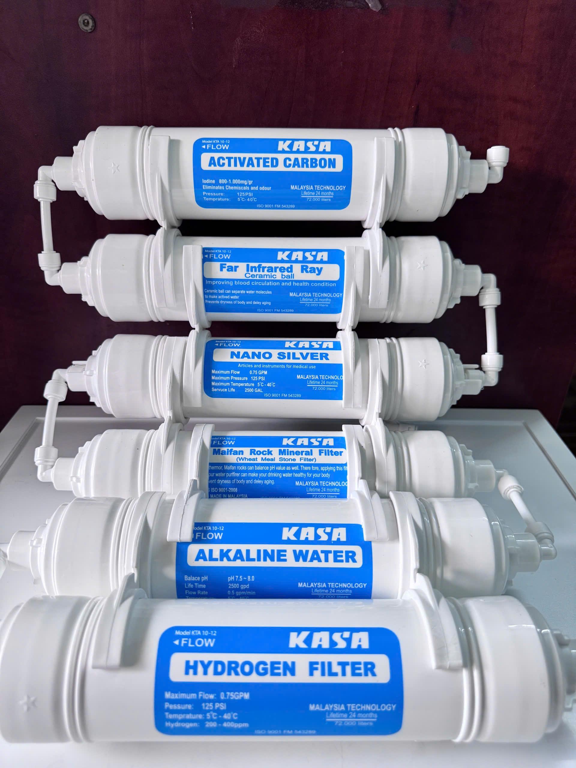 BỘ 6 LÕI KHOÁNG KASA -LÕI CÔNG NGHỆ HYDROGEN THẾ HỆ MỚI BỔ SUNG KHOÁNG CHẤT CẦN CHO CƠ THỂ. Thời gian sử dụng lõi: 18-24 tháng -- Lõi lọc Activated Carbon: Chức năng: Hấp phụ màu, mùi, cân bằng độ pH giúp tăng vị tươi mát của nước - Lõi lọc far Cơ chế bức xạ hồng ngoại để chia các nhóm phân tử nước nhỏ hơn, tăng lượng oxy trong nước để cơ thể có thể hấp thụ dễ dàng hơn, tránh khô da và giảm quá trình lão hóa. - Lõi Nano Silver: Với tính năng rất độc đáo do có màng khử khuẩn cấu trúc tiên tiến được các nhà khoa học hàng đầu Hoa Kỳ nghiên cứu ứng dụng và cải tiến nhiều lần. Lõi lọc nước Nano Silver sẽ giúp các bạn loại bỏ những độc tố từ nguồn nước nhiễm bẩn , Được cấu tạo từ than hoạt tính tích hợp với vật liệu nano bạc nhằm diệt sạch vi khuẩn, nấm có hại nhiễm từ môi trường - Lõi lọc Ankaline là lõi lọc không thể thiếu trong máy lọc nước . Lõi Ankaline với chức năng làm mềm và nước có vị ngon hơn, phù hợp với nhu cầu sử dụng của mọi người, Ổn định lại vị ngọt tự nhiên của nước, cân bằng pH - Lõi lọc maifan (Lõi Khoáng đá): – Lõi lọc khoáng đá có chức năng bổ sung khoáng chất, chất điện giải có ích cần thiết cho cơ thể con người, Làm vị nước ngon hơn. - Lõi lọc Hydrogen (Lõi ORP) Giảm ORP của nước, giúp tăng cường miễn dịch của cơ thể, giảm các bệnh tật do quá trình lão hóa tế bào gây ra. - Nâng cao pH, hỗ trợ cơ thể trung hòa axit dư, chống oxy hóa, tăng cường sức khỏe. Bổ sung khoáng chất, chất điện giải có ích.