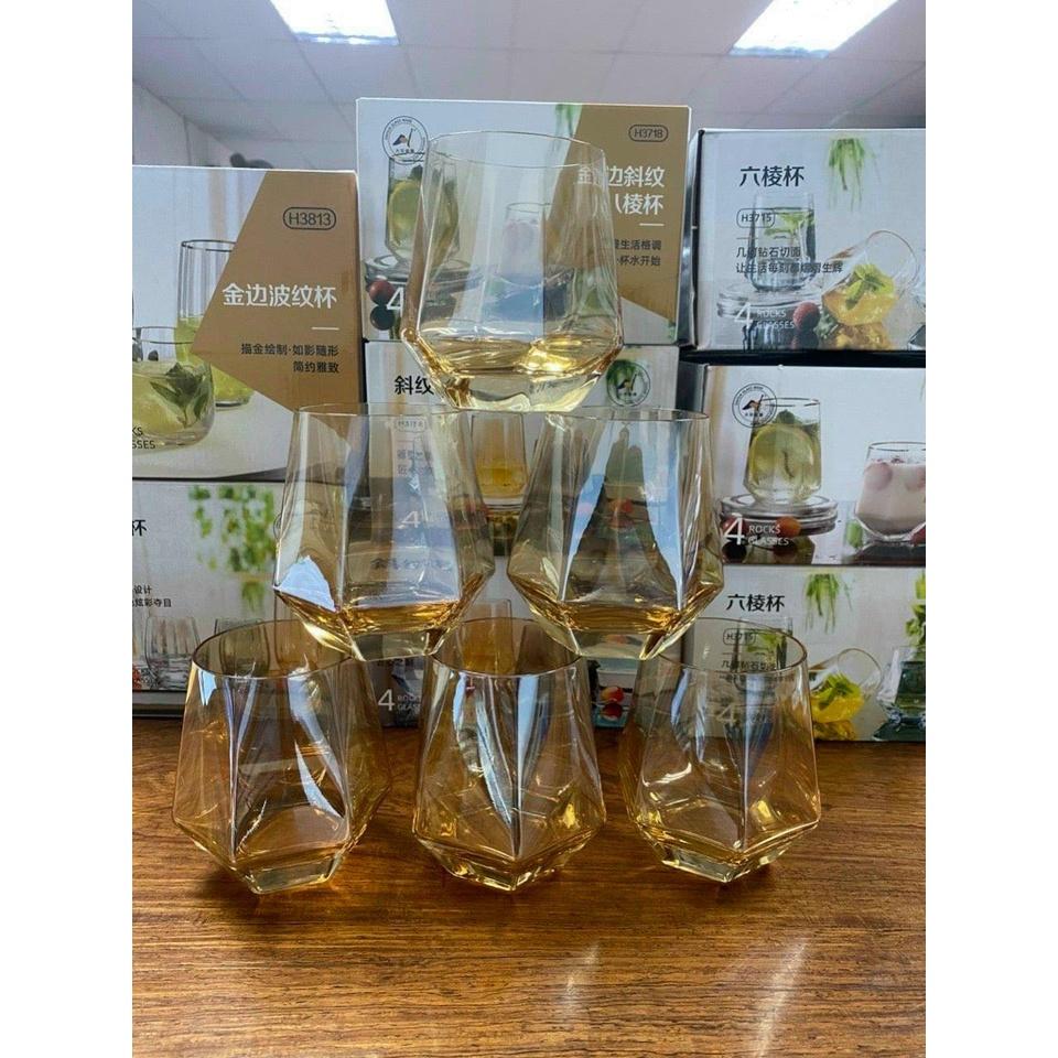 ✨Bộ 6 ly thủy tinh chịu nhiệt cao cấp dùng uống nước hoặc rượu tây vân kim cương vàng