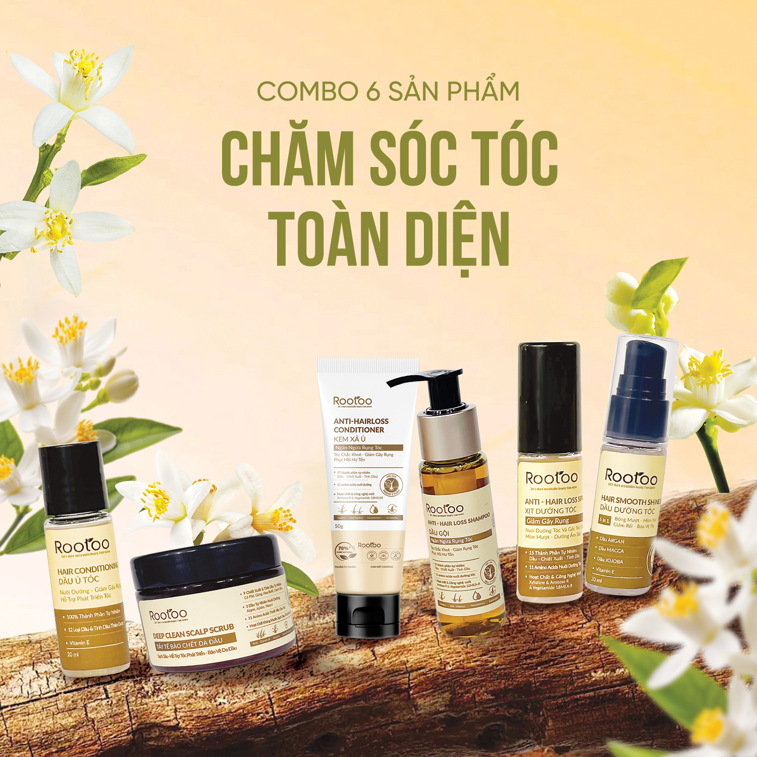 Combo 6 sản phẩm Haircare Collection ROOTOO cho mái tóc bồng bềnh tự nhiên Combo 6 sản phẩm: Dầu Ủ Dưỡng Tóc ROOTOO Thuần Tự Nhiên Giúp Tóc Mềm Mượt, Kích Thích Mọc Tóc Và