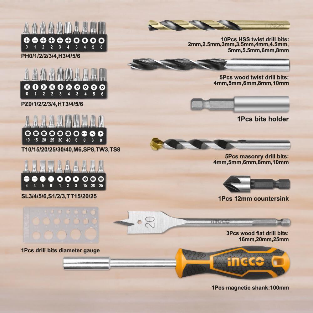 Bộ dụng cụ đồ nghề gia dụng INGCO HKTHP11081 108 chi tiết, gồm 1 khoan pin, 1 khoan búa, mũi khoan
