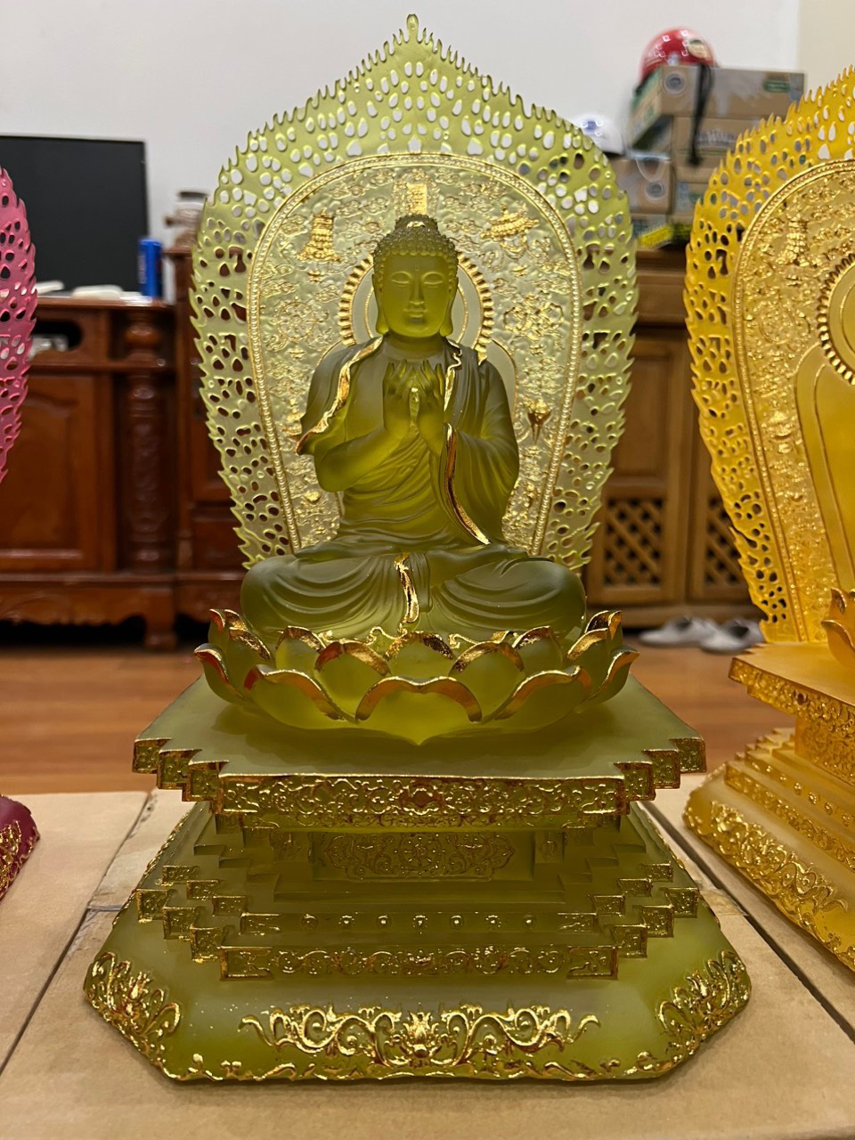 Tượng Phật Quan Âm Đá Lưu Ly Vàng Mới để trong xe hơi hoặc để bàn cao 12cm đk 7cm đế 5cm Mệnh Kim mệnh Thổ mệnh Thủy ạ *** Tượng Phật Quan Âm Đá