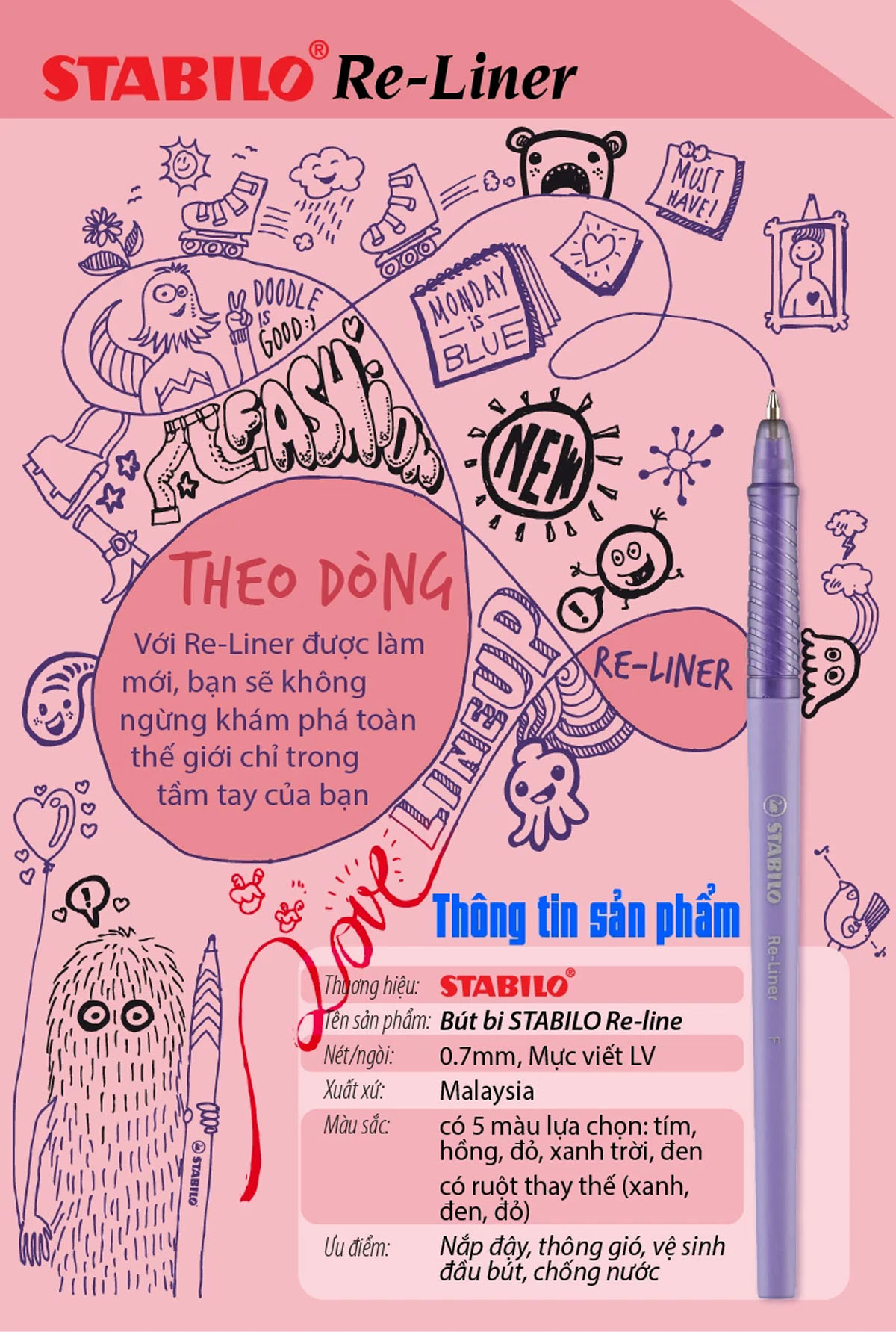 - Đầu bi: 0.8 mm dạng Cone , sản xuất tại Thụy Sĩ. - Grip cùng màu mực - Độ dài viết được: 1.200-1.500m. - Thân bút thanh mảnh cơ chế bấm khế tiện dụng