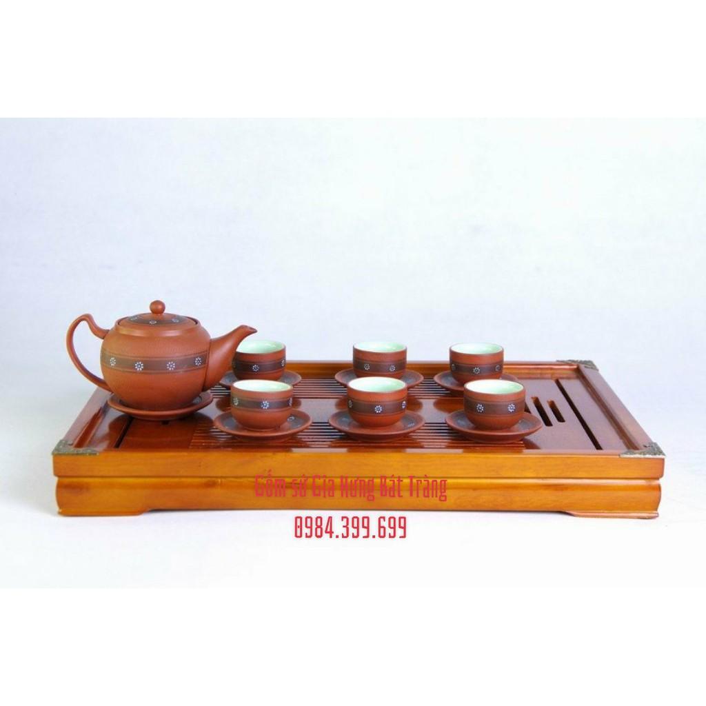 Bộ ấm trà gốm đắp tay khay chữ nhật 29 x 19cm - chuẩn loại 1 Bát Tràng + Chất liệu đất tử sa cao cấp + Sản xuất tại Bát Tràng + Bộ gồm