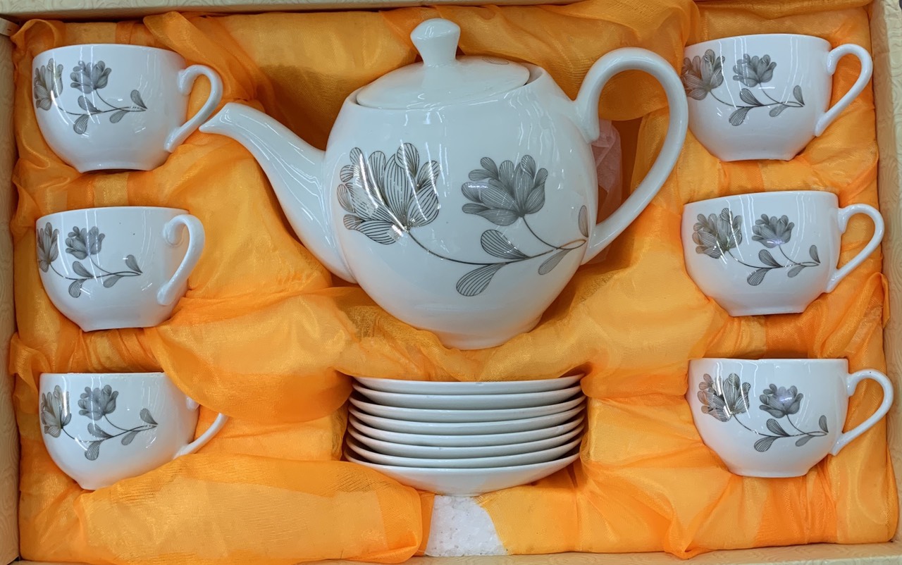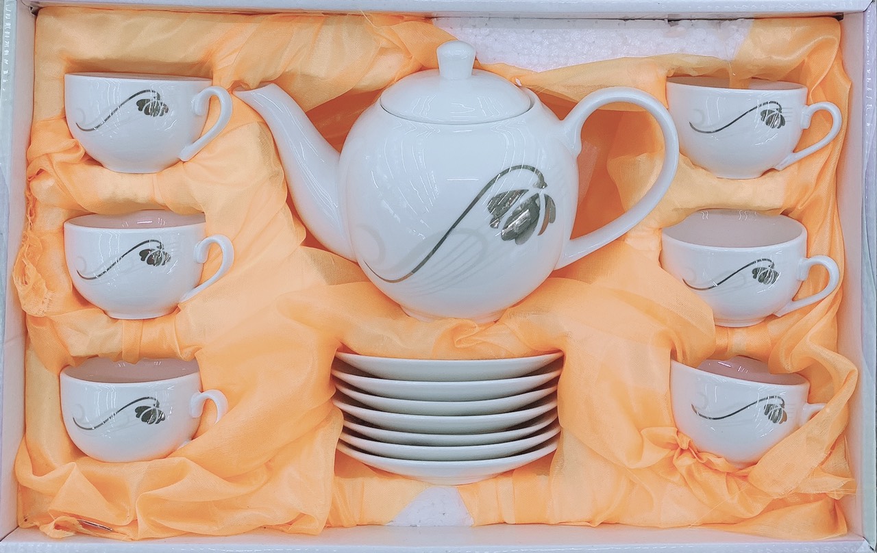Một bộ sản phẩm bao gồm: 01 ấm, 01 đĩa ấm, 06 chén và 06 đĩa chén. Bộ sản phẩm được làm từ chất liệu gốm cao cấp, bảo đảm an toàn vệ sinh