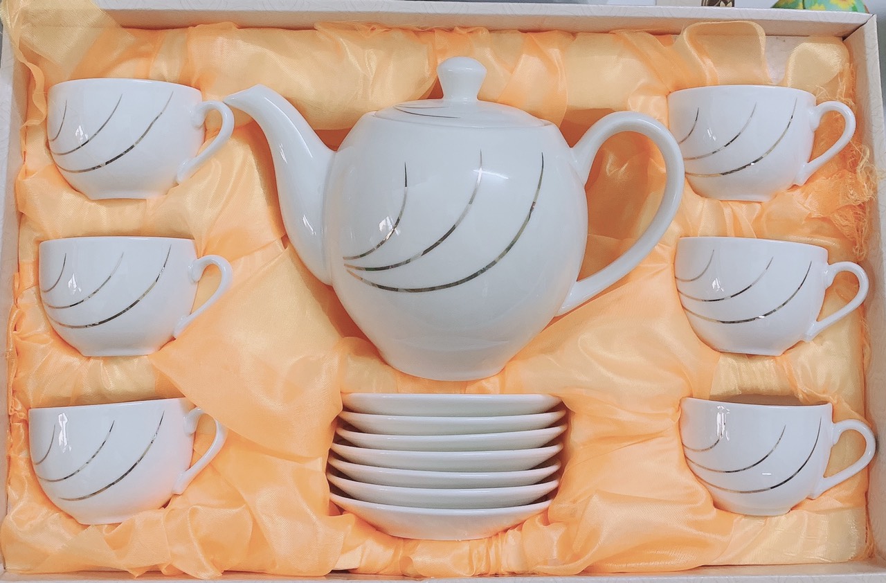Một bộ sản phẩm bao gồm: 01 ấm, 01 đĩa ấm, 06 chén và 06 đĩa chén.    Bộ sản phẩm được làm từ chất liệu gốm cao cấp, bảo đảm an toàn vệ sinh
