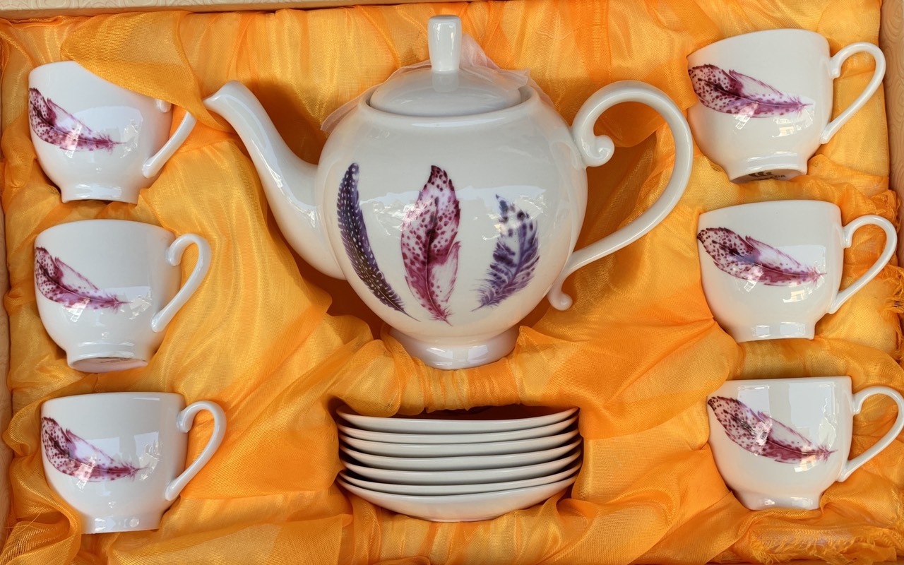 ✨Bộ ấm chén pha trà sứ trắng họa tiết lông vũ tím