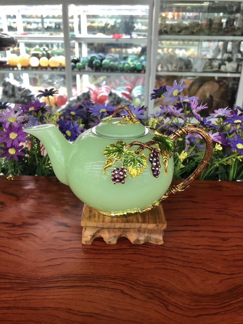 ✨Bộ ấm trà chạm cây nho tím với ly chạm chữ đá ngọc cẩm thạch xanh