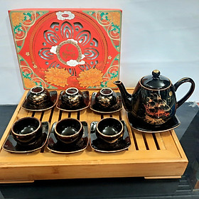 Bộ bình trà men đen bóng, vẽ vàng 24k, mã 114072, thuận buồm xuôi gió, ấm chén 500ml gốm bát tràng
