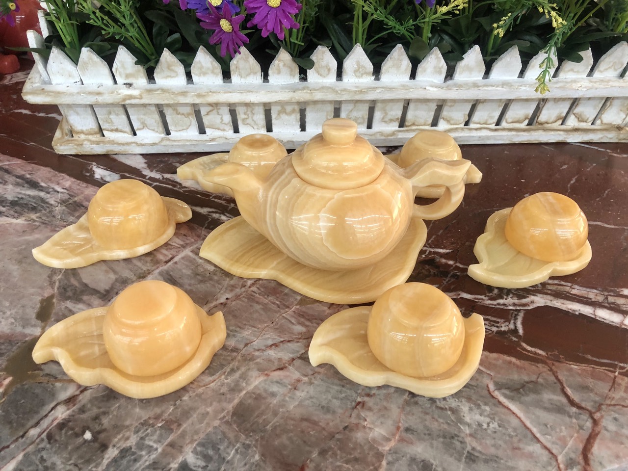 Chất liệu: Đá ngọc Onyx Bộ sản phẩm gồm: 7 dĩa, 6 ly và 1 ấm trà Khối lượng: 1,5 kg Sử dụng làm vật phẩm trang trí nhà cửa, quà biếu hoặc có thể