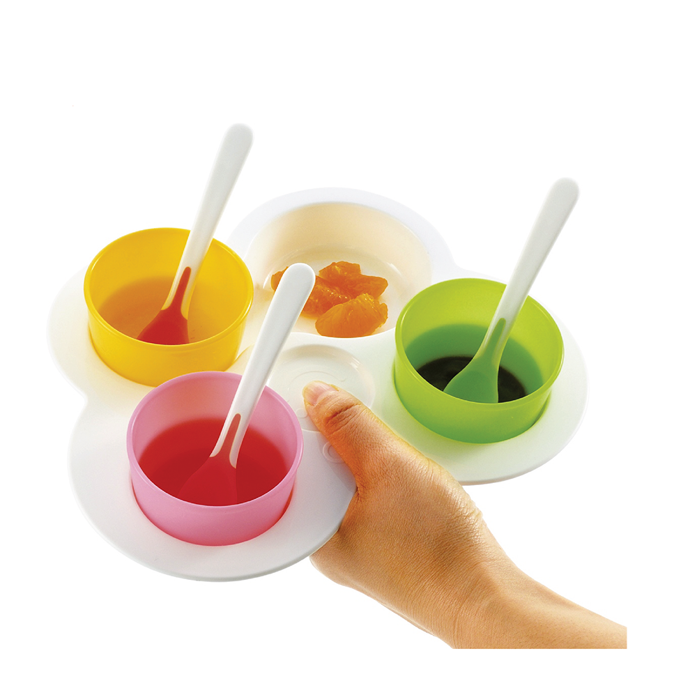• 3 thìa mềm riêng biệt để chia thức ăn cho bé theo từng loại theo màu sắc của các cốc.