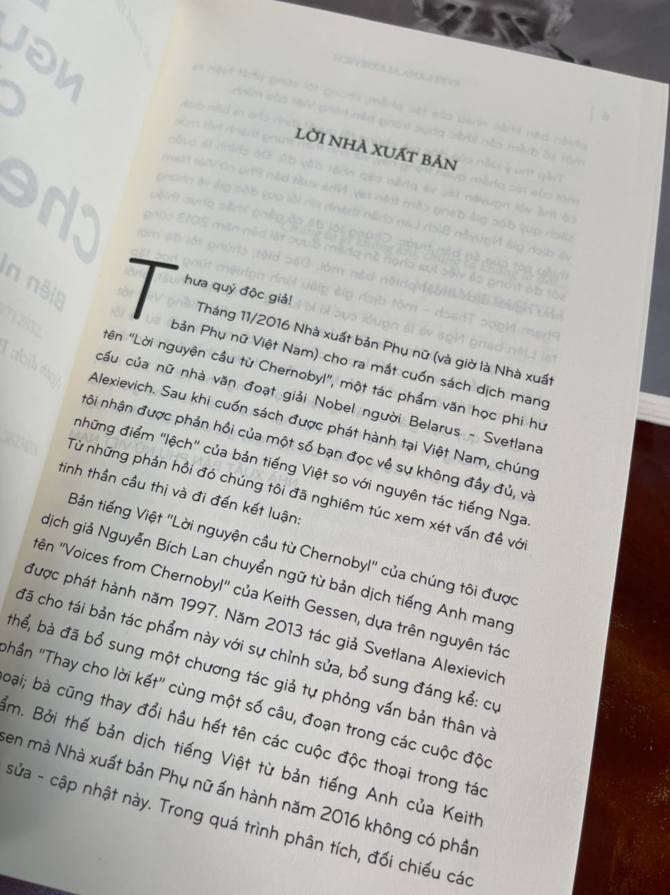 Tôi bình sinh nào có thấu hiểu giá trị văn chương, đọc tác phẩm đoạt giải này thưởng nọ thường ngẩn ngơ không tỏ. Nhưng Nobel văn học 2015 là điều khác biết và cái tên Svetlana Alexievich trở thành nhà văn yêu mến nhất của tôi. Công ấy là nhờ Tao Đàn, Phụ Nữ cũng các dịch giả gạo cội Liên Xô giới thiệu cho ta: Chiến tranh không có một khuôn mặt phụ nữ, Những nhân chứng cuối cùng, Lời nguyện cầu từ C