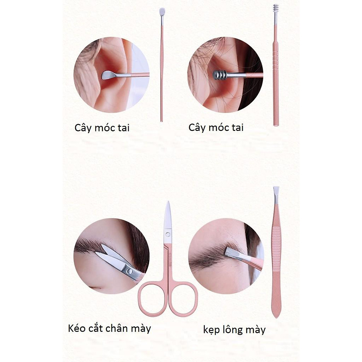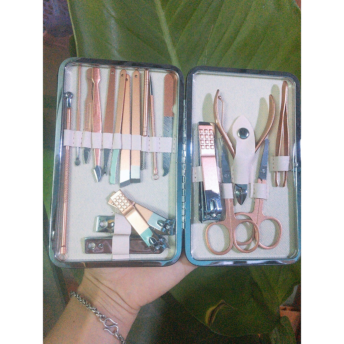 Bộ sản phẩm gồm 18 món: 3 đồ bấm móng tay lớn + vừa + nhỏ, kéo cắt lông mũi, kềm cắt da, cây nặn mụn, 1 cây móc tai, 1 dũa, 1 nhíp, 2 cây lấy khóe, 1 dụng cụ làm sạch móng,