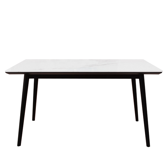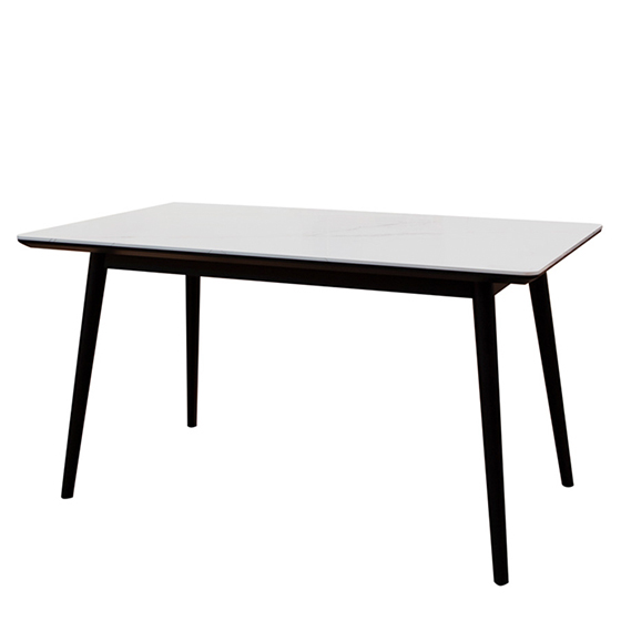 Mặt bàn ăn bằng đá Ceramic có độ chịu nhiệt cao, màu trắng sáng vân mây tạo không gian rộng lớn hơn cho phòng bếp. Góc bàn được bo tròn đảm bảo an toàn, tránh gây tổn thương khi va chạm. Khung bàn bằng gỗ phủ sơn đen thanh lịch.