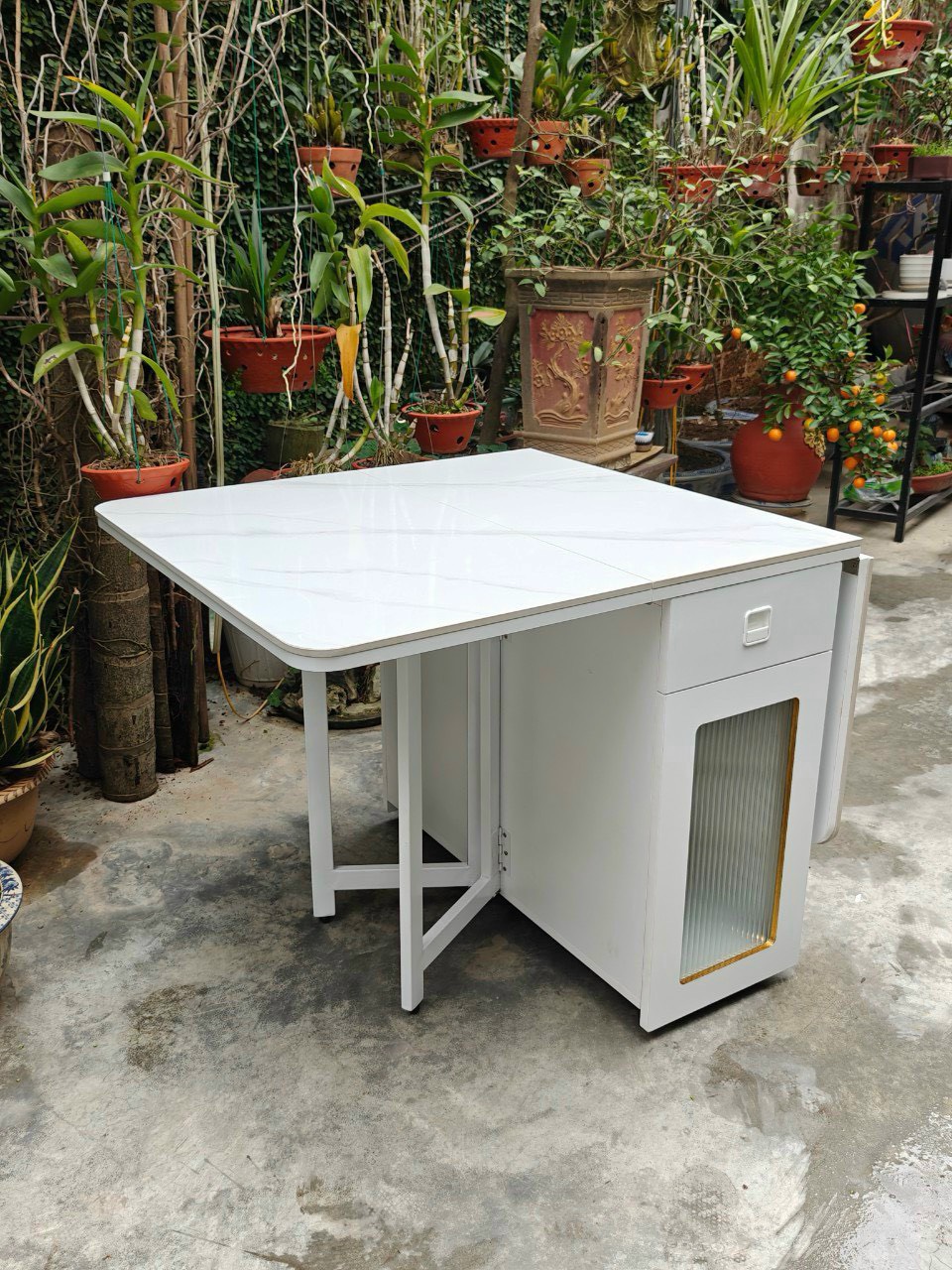 Bàn ăn thông minh gấp gọn tiện dụng giá tại xưởng ! Kích thước cụ thể: Khi mở rộng : Dài 1600 x Rộng 850 x Cao 750 Khi gấp gọn : Dài 850 x Rộng 4̉60 x Cao 750 Chất liệu Bàn : Thân gỗ MDF Thái chống ẩm. Chân thép tĩnh điện. Mặt đá CERAMIC chống xước chống ố.
