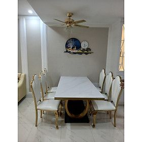 ✨Bộ bàn ghế phòng ăn cao cấp Juno sofa mặt trắng vân mây, đế tròn mạ PVD kèm 6 ghế
