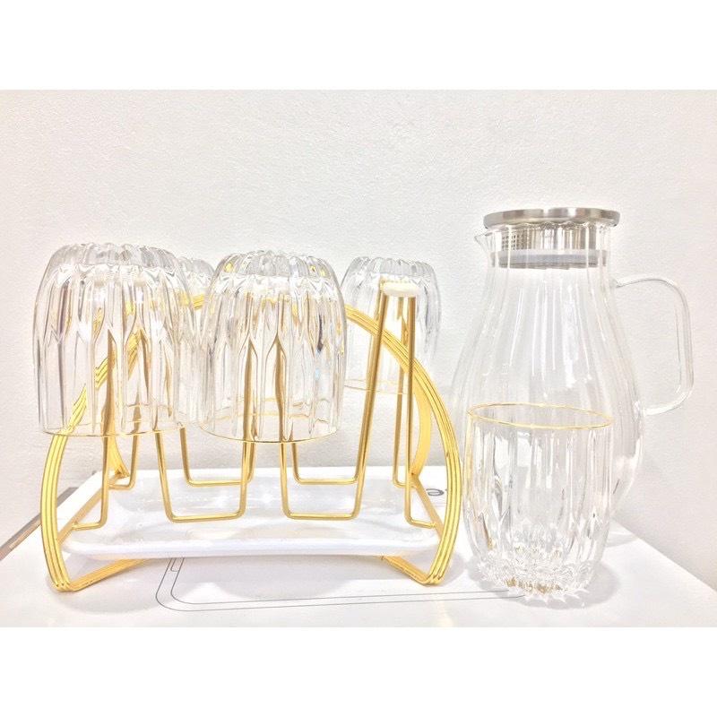 Combo Bộ 6 cốc thủy tinh cao cấp kèm giá úp tròn có khay hứng Combo gồm: 1 bình 6 cốc cốc 1 giá úp hươu 1 khay vương miện