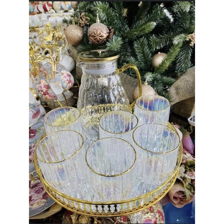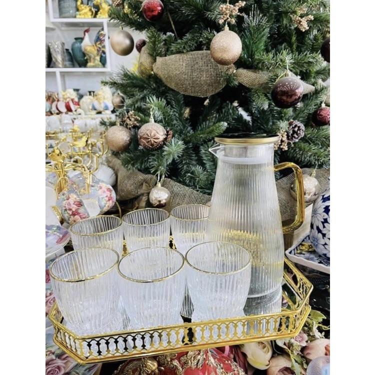 ✨Bộ bình đựng nước uống thủy tinh vân sần cốc loe thấp kèm khay