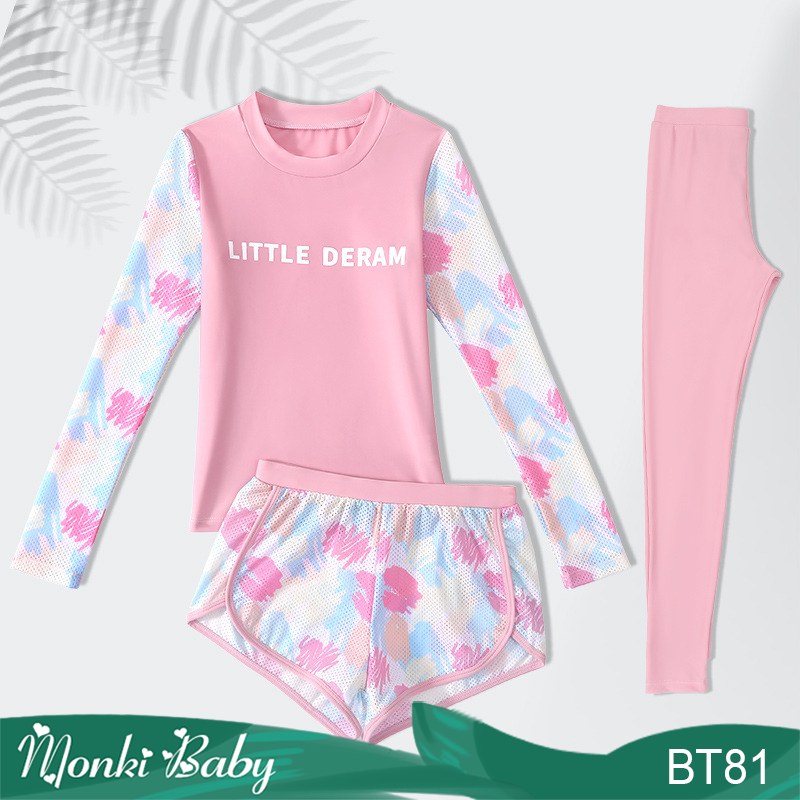 Bộ đồ bơi bé gái 3 chi tiết với thiết kế áo dài tay, quần dài che chắn toàn diện, giúp bé thoải mái vui đùa dưới ánh nắng hè mà không lo bị cháy nắng hay côn trùng.