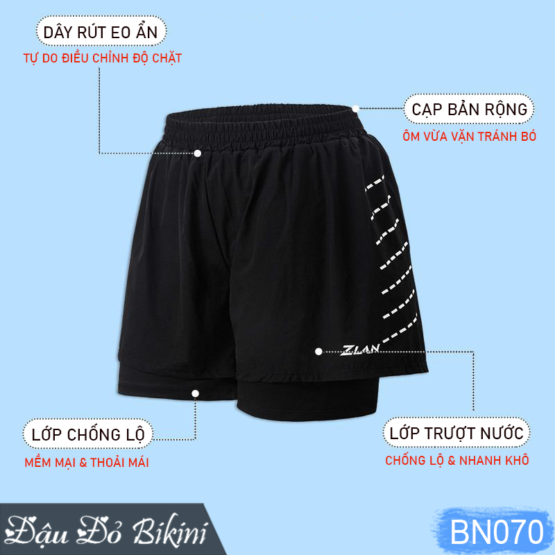 - Quần bơi 2 lớp: Quần gồm lớp trong ôm sát, co giãn, giúp cố định chắc chắn và lớp ngoài dạng short rộng rãi, mang lại sự kín đáo. Đường sọc trắng dọc hai bên quần tạo phong cách năng động, đồng thời dây rút thắt lưng giúp điều chỉnh kích cỡ dễ dàng, phù hợp với mọi vòng eo.