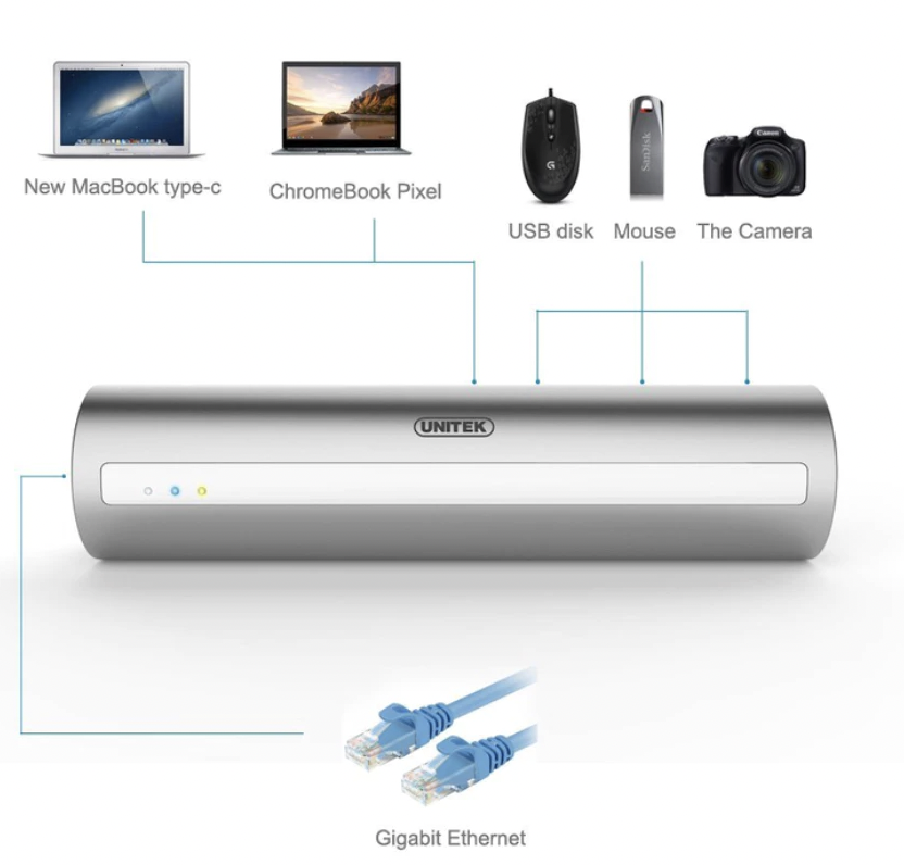 Thêm vào đó, Bộ chia USB Type-C ra 3 cổng USB 3.0 Unitek Y-3095 và 1 cổng Lan Gigabit được trang bị thêm một bộ chuyển đổi Gigabit Ethernet, đây là giải pháp tốt nhất cho những dòng máy tính xách tay / Ultrabook mà không có cổng Ethernet (RJ45). Hỗ trợ mạng IPv4 / IPv6, tiết kiệm điện năng và hỗ trợ Wake-On-LAN.