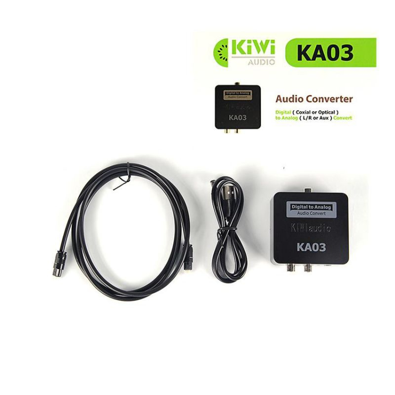 - Thiết kế của Bộ chuyển quang âm thanh KA 03 Bộ chuyển quang âm thanh TV 4K quang optical sang audio AV ra amply + Cáp optical Kiwi KA03 thiết kế khá nhỏ gọn với màu đen đặc trưng được in chìm thương hiệu Kiwi ngay trên mặt sản phẩm, kết nối 2 đầu để chuyển đổi âm thanh từ Coxial/Optical sang Analog Đầu vào Input: có cổng Coaxial, OptIcal cùng cổng cắm nguồn 5V hỗ trợ cắm với các thiết bị như Smart TV, Android TV Boxx Đầu ra Output có các cổng: Stereo, Cổng 3.5mm hỗ trợ cắm với dàn loa, amply đời cũ Cạnh trái bao gồm các cổng lần lượt cổng cắm nguồn, cổng vào coaxial Cạnh phải của bộ chuyển đổi âm thanh gồm các cổng Jack ra 3.5, đèn báo tín hiệu và tín hiệu ra kênh L+R