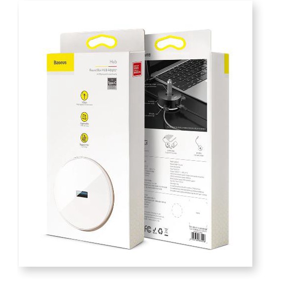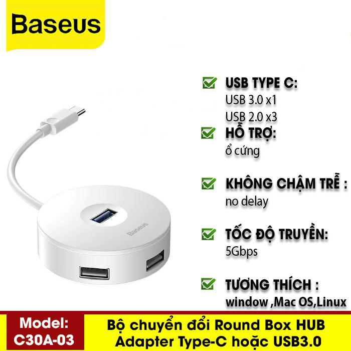- Thiết kế đẳng cấp và sang trọng, tạo cảm giác thích thú khi sử dụng. MÔ TẢ SẢN PHẨM Bộ Chuyển Đổi Baseus Round Box HUB Adapter Type-C Hoặc USB3.0 To USB3.01 + USB2.03 Cho PC - Thương Hiệu Baseus • Thương hiệu: Baseus • Chất liệu: ABS + dây TPE • Đầu vào: Loại C / Loại A USB 3.0 • Đầu ra: USB3.0 1, USB 2.0 3 • Tốc độ truyền USB 3.0: 5Gbps • Nguồn cung cấp micro 5V: Hỗ trợ đĩa cứng 4TB • Chiều dài: 100 ± 15mm • Kích thước: 60,3x60,3x23mm • Trọng lượng: 40g