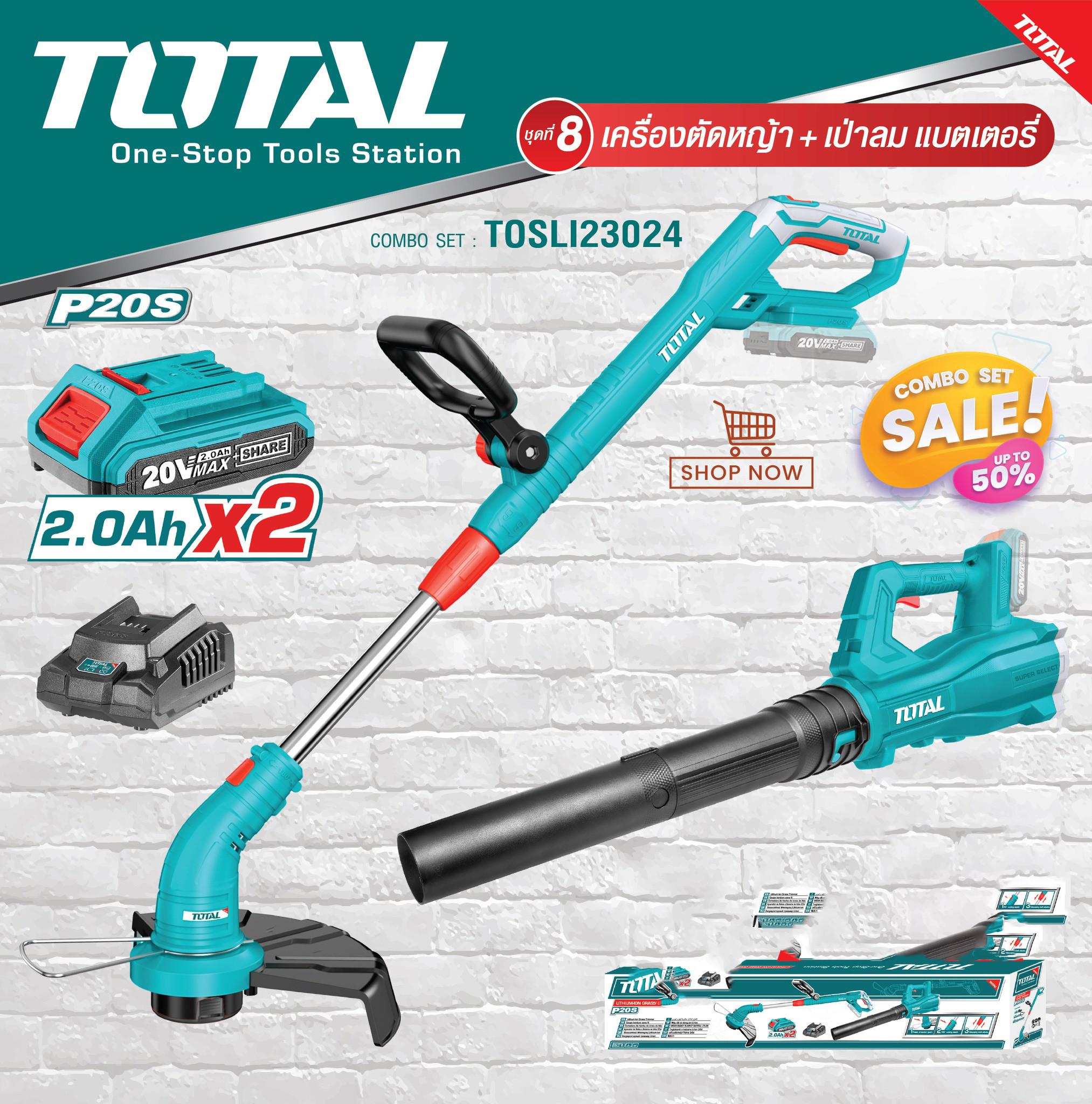 Bộ combo TOTAL TOSLI23024 gồm máy cắt cỏ TGTLI20018 và máy thổi bụi dùng pin 20V TABLI20323, là sự lựa chọn hoàn hảo cho công việc làm vườn của bạn. Với hiệu suất cao, tính năng tiện ích và độ bền vượt trội, bộ combo này sẽ giúp bạn tiết kiệm thời gian và nỗ lực trong việc chăm sóc khuôn viên xanh của gia đình.