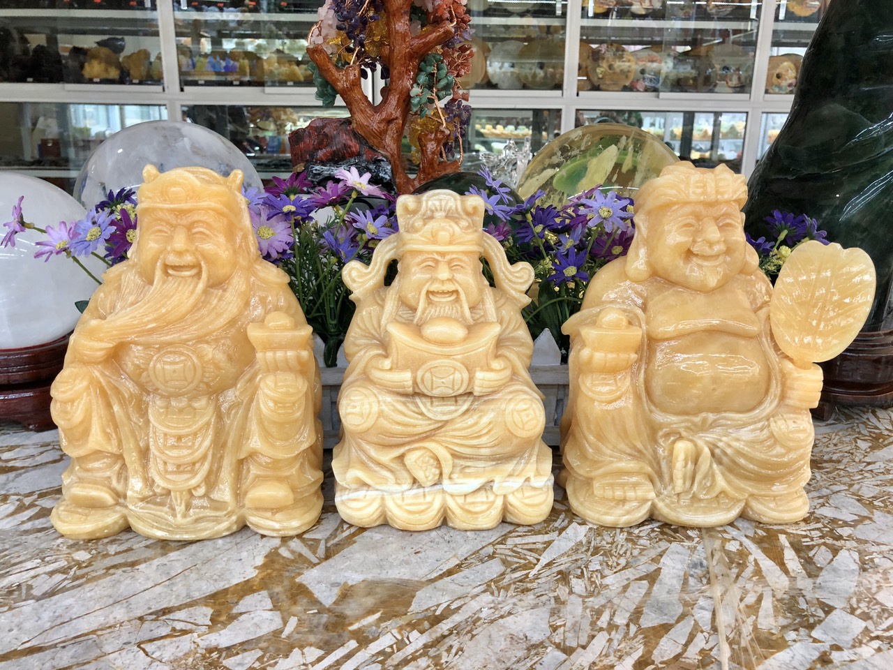 Chất liệu: Đá ngọc hoàng long Kích thước: Dài 15 cm x Rộng 10 cm x Cao 20 cm Khối lượng: 4,4 kg Thần Tài là vị thần trông coi tiền tài, vàng bạc, mang