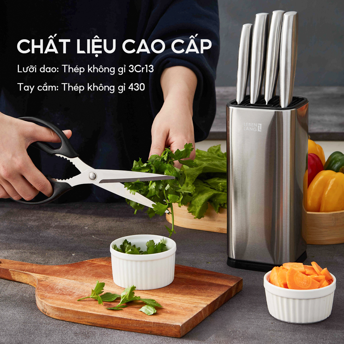 - Đồng hành cùng mỗi gia đình, bộ dao Lebenlang LBL1956 không chỉ là dụng cụ mà còn là người bạn đồng hành trong mỗi bữa ăn.