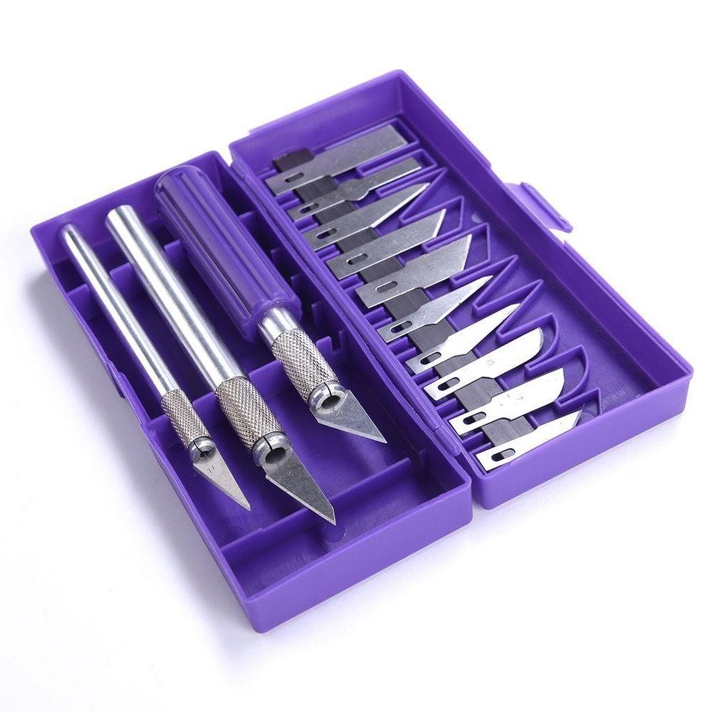 Bộ dao với ba tay cầm (sử dụng hạng nặng, trung bình và tiêu chuẩn) và bao gồm 13 lưỡi có thể hoán đổi cho nhau. Bộ này hoàn hảo để cắt nhiều loại vật liệu khác nhau bao gồm bìa cứng, vải, da và nhựa. Được chế tạo từ thép SK5 để đảm bảo độ sắc bén của lưỡi tuyệt vời và độ bền kéo dài. Đi kèm trong một hộp đựng có dải từ tính để giữ các lưỡi phụ được cất giữ an toàn.